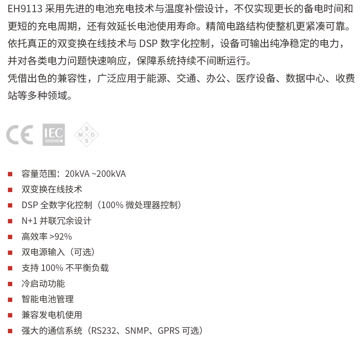 EH9113 采用先进的电池充电技术与温度补偿设计,不仅实现更长的备电时间和更短的充电周期,还有效延长电池使用寿命。精简电路结构使整机更紧凑可靠。依托真正的双变换在线技术与 DSP 数字化控制,设备可输出纯净稳定的电力,并对各类电力问题快速响应,保障系统持续不间断运行。