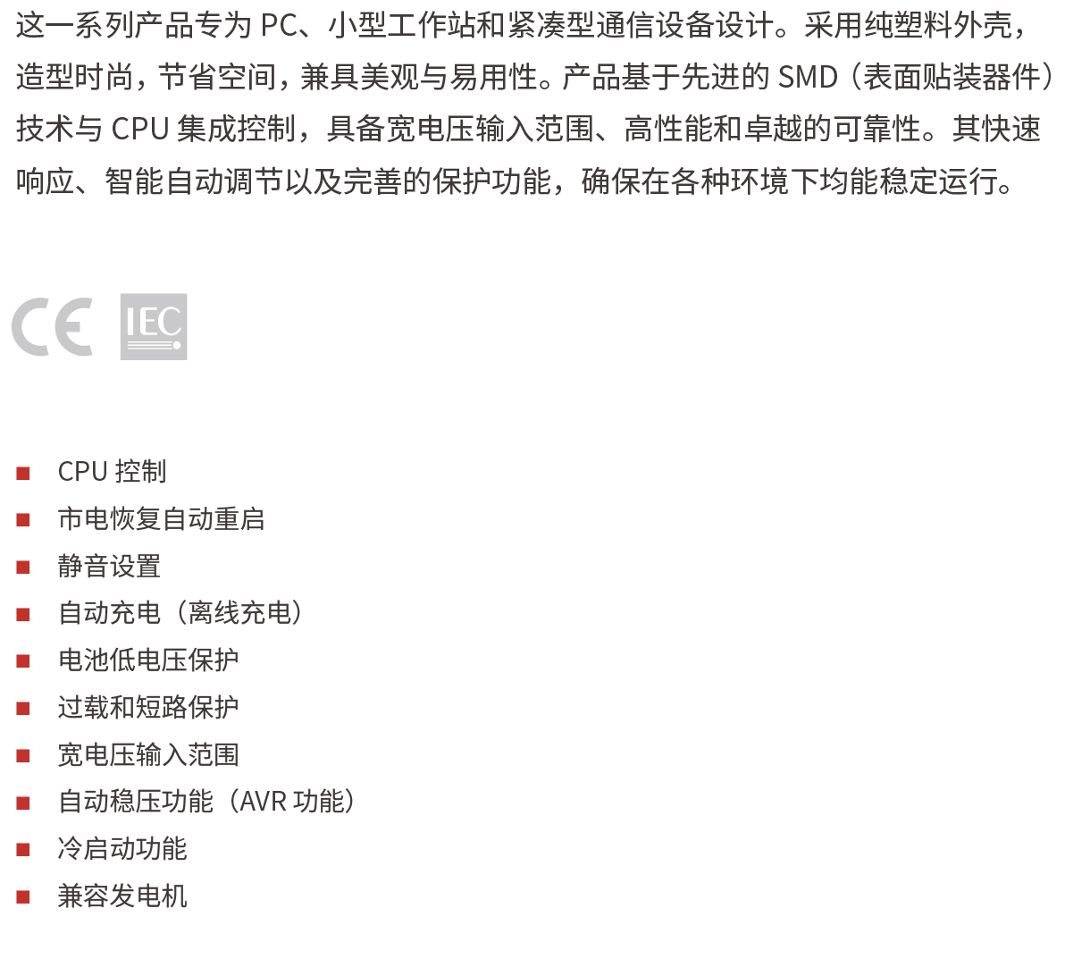 这一系列产品专为 PC、小型工作站和紧凑型通信设备设计。采用纯塑料外壳,造型时尚,节省空间,兼具美观与易用性。产品基于先进的 SMD(表面贴装器件)技术与 CPU 集成控制,具备宽电压输入范围、高性能和卓越的可靠性。其快速响应、智能自动调节以及完善的保护功能,确保在各种环境下均能稳定运行。