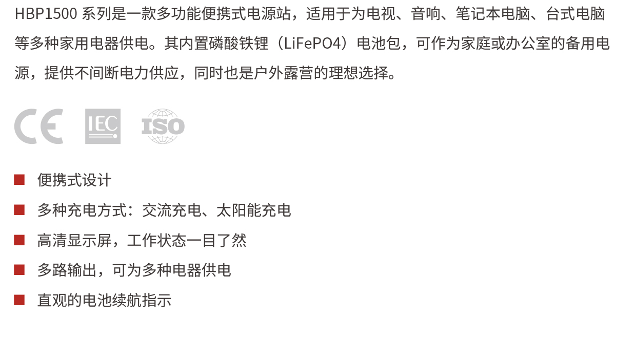 应用领域: HBP1500 系列是一款多功能便携式电源站,适用于为电视、音响、笔记本电脑、台式电脑等多种家用电器供电。其内置磷酸铁锂(LiFePO4)电池包,可作为家庭或办公室的备用电源,提供不间断电力供应,同时也是户外露营的理想选择。